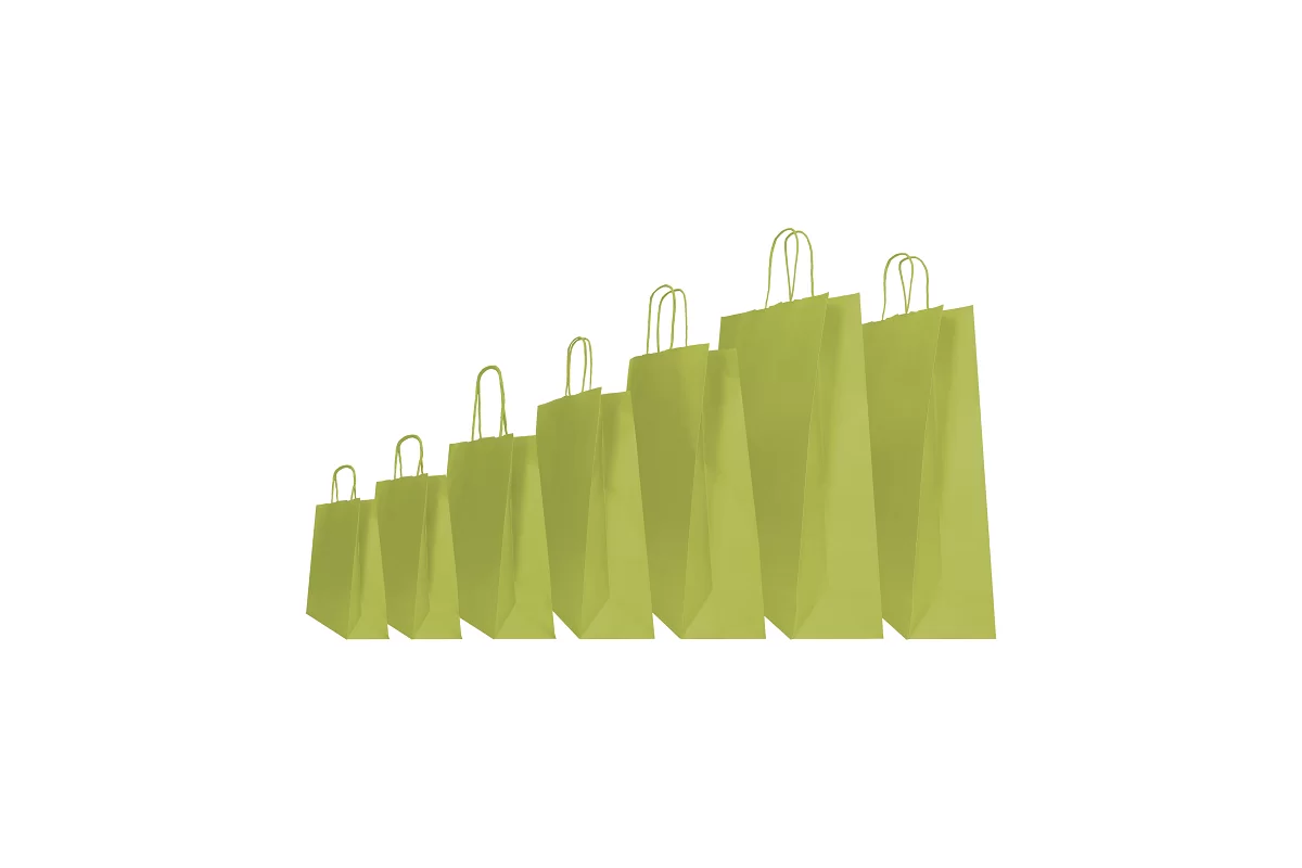 Värvilised Twist-taskukotid, mis on valmistatud taaskasutatud valgest jõupaberist, mille sisse on liimitud keeratud paberist käepidemed. FSC® sertifitseeritud paber. Koti väliskülg on värviline, sisekülg on valge. Kott on vesivärvitud ja kaetud kaitsva lakiga. Käepidemed on värvitud koti värvi. Kottide paber on tugev ja peab vastu kuni 11 kg kaalule. Sobib toiduainete, kingituste või kliendikaupade jaoks. Värv on helerohelised. Valmistatud Itaalias.