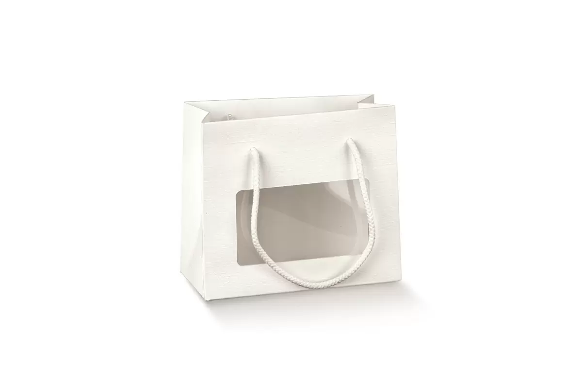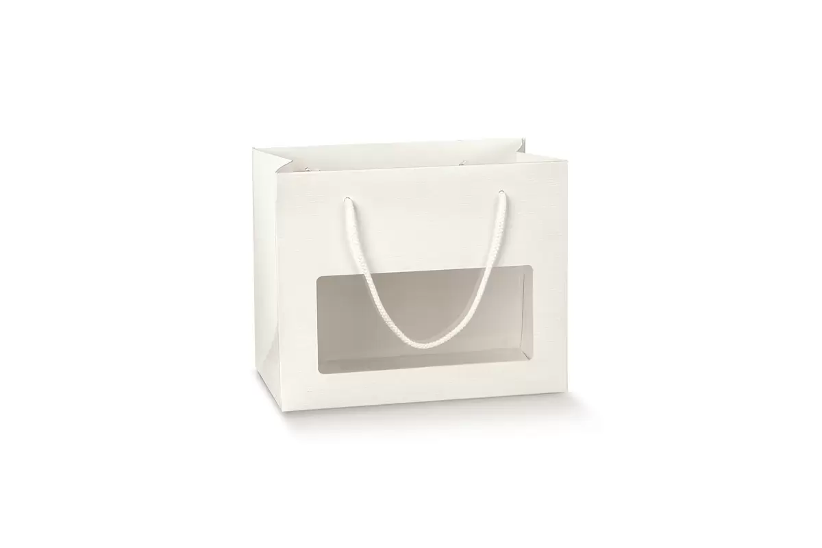 Kokybiškas, tvirtas popierinis maišelis su medžiaginėmis rankenėlėmis ir biologiškai suyrančiu pvc. langeliu.