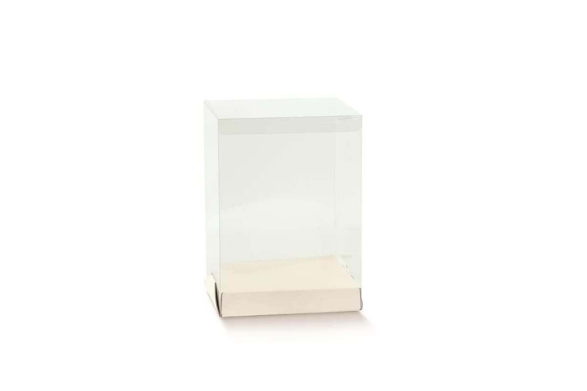 Skaidri pvc. dėžė su baltos spalvos įdėklu.